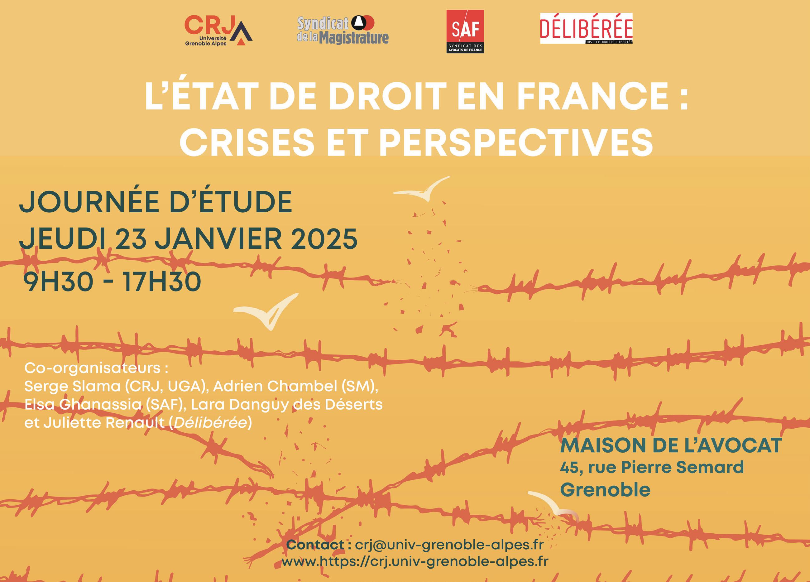 Une journée pour échanger sur la crise de l'État de droit en France, mais aussi sur les perspectives. Organisés par le centre de recherche juridique et l'université Grenoble Alpes, le syndicat de la magistrature, le syndicat des avocats de France et la revue Délibérée, les débats seront articulés sur deux tables rondes, une le matin, l'autre l'après-midi, réunissant des universitaires, avocat.es et magistrat.es judiciaires et administratif.ves. Voir le programme complet ici.