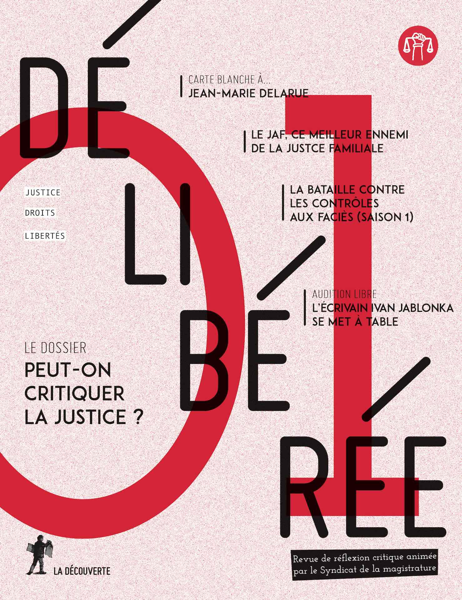 La justice est-elle une affaire trop sérieuse pour être confiée à ses seuls professionnels ? En tout cas, les critiques en place publique, quelle que soit leur justesse, sont légion. Ce qui n'empêche pas d'entendre régulièrement que la justice serait incritiquable. Pour son premier dossier, Délibérée a décidé de s'arrêter sur cette apparente contradiction en posant frontalement la question : peut-on, au juste, critiquer la justice ? Non pas pour nier l'évidence des contestations dont elle fait l'objet, encore moins pour se joindre au choeur ridicule de ceux qui passent leur temps à dire partout qu'on ne peut plus rien dire nulle part, mais pour interroger la fonction, réelle et perçue, de la justice au sein de notre société. Se poser cette question, éminemment politique, c'est faire le constat d'un problème : celui d'une justice qui peine décidément à trouver sa juste place dans la Cité. Délibérée pour ce premier numéro a également donné carte blanche à Jean-Marie Delarue et auditionné librement l'écrivain Ivan Jablonka.