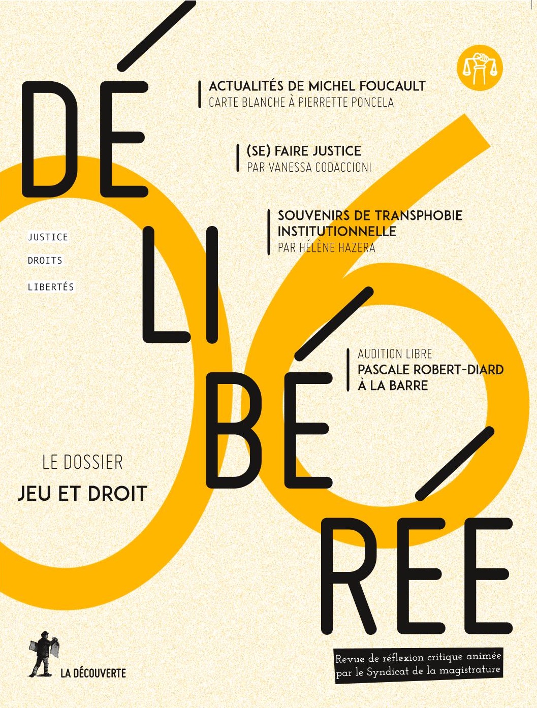 Pour le dossier, Délibérée a souhaité faire un pas de côté, et traiter des relations entre jeu et droit. Un dossier tout à la fois ludique et instructif, qui permet d'explorer la théorie du droit pour mieux en interroger les pratiques et tenter de comprendre pourquoi, en matière de justice comme en matière de jeux, selon les termes d'un professeur de droit américain, « les mêmes gardent toujours l'avantage » ; l'occasion encore de découvrir un exemple de justice de classe sous l'Ancien Régime, de tâter les frontières entre univers virtuel, droit pénal et droit des contrats, mais aussi de rattraper l'actualité par la bande avec un article faisant le point sur les conséquences néfastes prévisibles de la privatisation de la Française des Jeux, et un autre revenant sur le régime des interdictions administratives de stade. Dans ses autres rubriques, Délibérée a notamment fait comparaître à la barre, pour l'interviewer, Pascale-Robert Diard, chroniqueuse beaucoup lue dans le monde judiciaire.